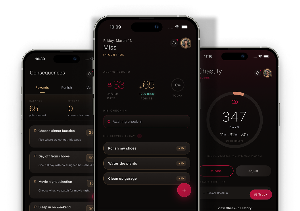 Earn points and redeem custom rewards for good behavior. Miss a task? Auto-assigned punishments, timer tasks, restrictions, or chastity lock extensions keep accountability real.