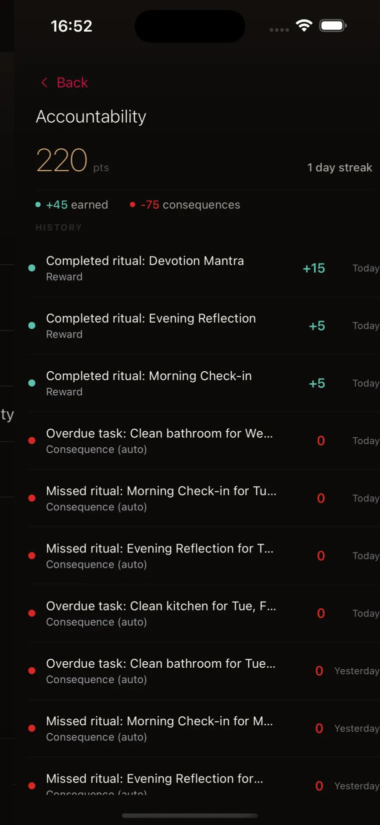 Schedule daily, weekly, or monthly rituals with streak tracking and point rewards.
