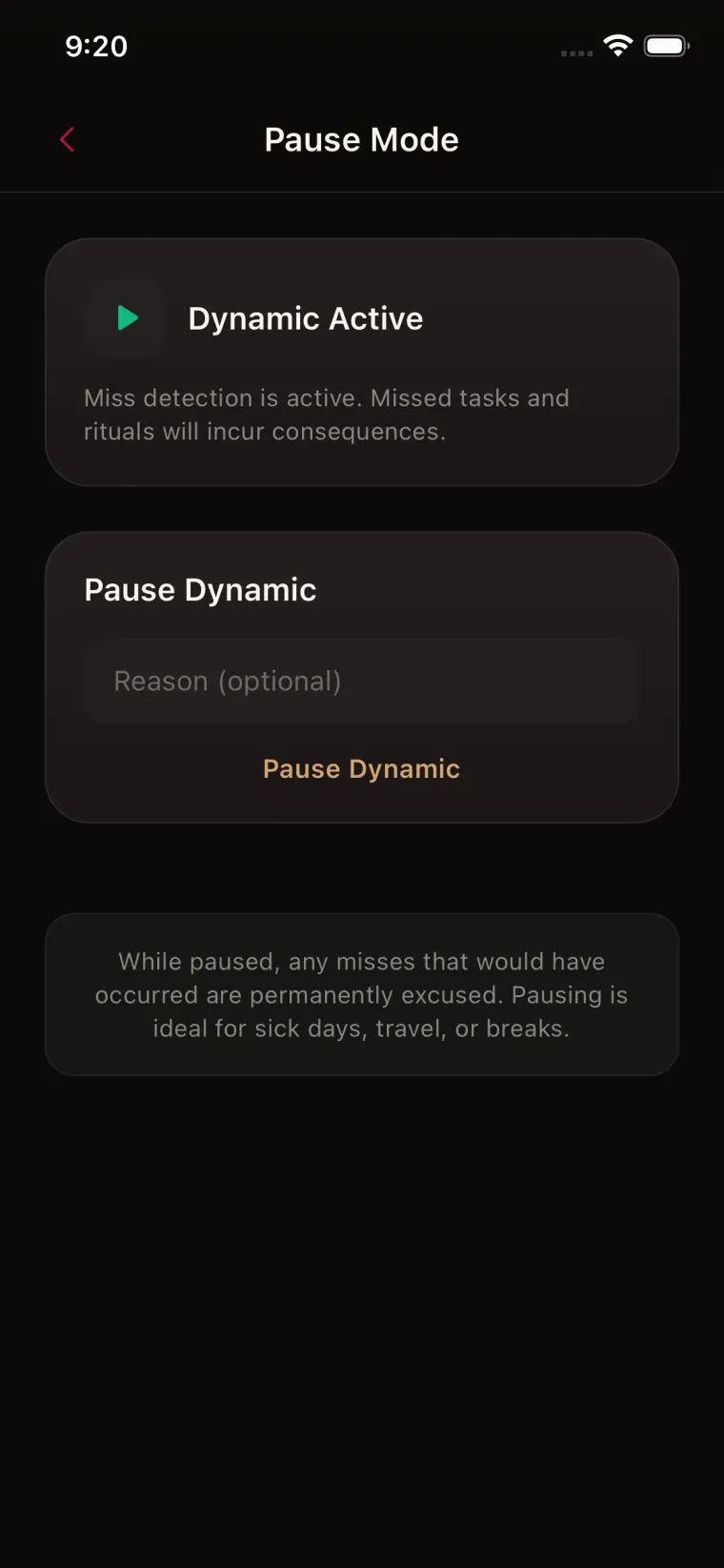 Freeze everything without losing data. Streaks, deadlines, and notifications pause together.