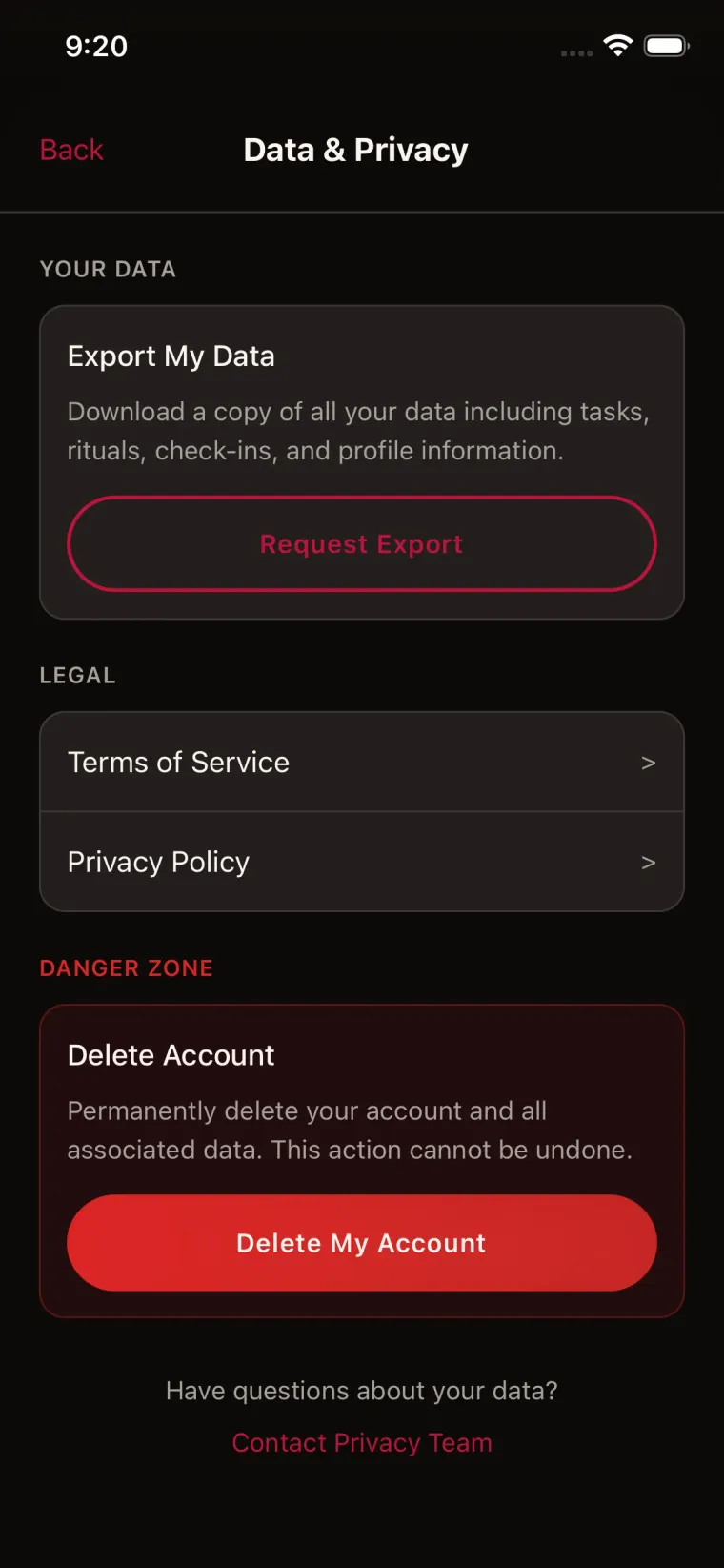 Export all your data anytime. Tasks, rituals, points, check-ins — everything you've built.