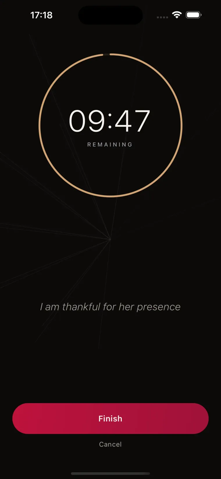 Timed meditation rituals with cycling affirmations and ambient breathing animations.
